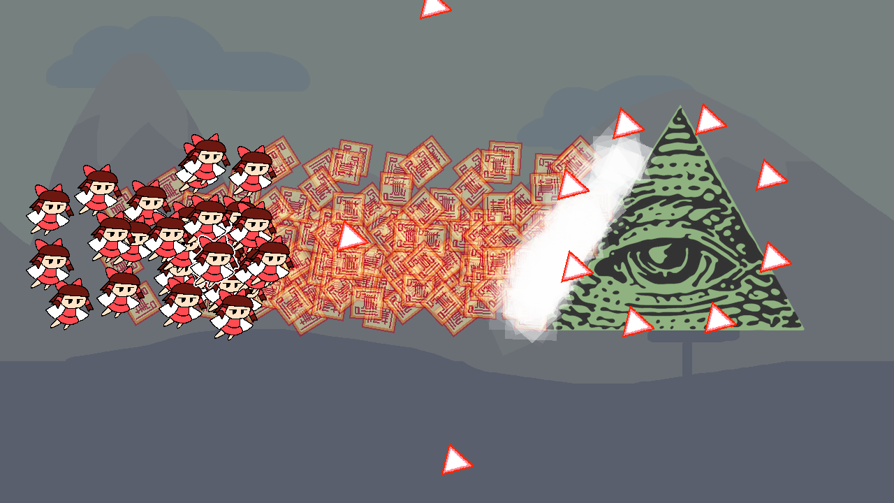 An army of EVIL triangles has invaded Gensokyo! Play as Reimu, who has acquired the power of mitosis, and put an end to the triangle gang foul schemes.